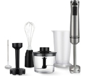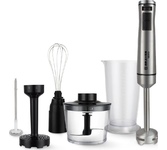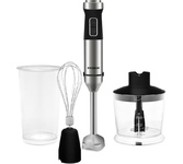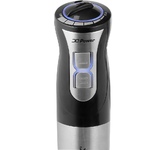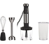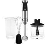 Мощность 1200 Вт Погружная часть и лезвия из нержавеющей стали Корпус из пластика, декорирован нержавеющей сталью Плавная регулировка скорости Насадка-венчик для взбивания Стакан для смешивания 700 мл Насадка-блендер для измельченияи смешивания Насадка для приготовления пюре Капучинатор Насадка-измельчитель объемом 500 мл Электропитание 220-240 В, ~ 50-60 Гц