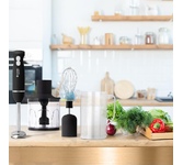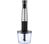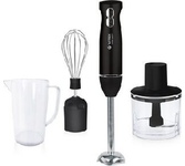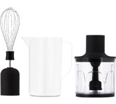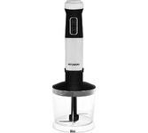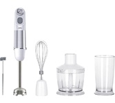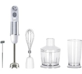 Мощность 1500 Вт Лезвия из титана Погружная часть из нержавеющей стали Корпус из пластика, декорирован нержавеющей сталью Плавная регулировка скорости Турборежим Скорость вращения: 14000 об/мин ± 10% Насадка-венчик для взбивания Стакан для смешивания 600 мл Удлиненная насадка-блендер для измельчения и смешивания Насадка-измельчитель объёмом 500 мл Длина шнура 1 м Электропитание 220-240 В, 50-60 Гц