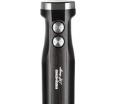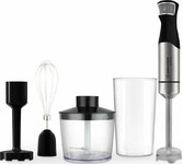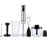 Максимальная мощность 1000 Вт Погружная часть и лезвия из нержавеющей стали Корпус из пластика, декорирован нержавеющей сталью Плавная регулировка скорости 5 скоростей Турборежим Скорость вращения: 15000 об/мин 20% Насадка венчик для взбивания Стакан для смешивания 700 мл Насадка блендер для измельчения и смешивания Насадка измельчитель объёмом 500 мл Насадка для приготовления пюре Длина шнура 1,2 м Электропитание 220 240 В, 50 60 Гц