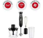 Мощность 1200 Ватт. Плавная регулировка скорости. Венчик для взбивания. Стакан емкостью 600 мл. Измельчитель емкостью 800 мл. Насадка для измельчения картофеля. Характеристики: Напряжение: 220-240 В Частота: 50/60 Гц Потребляемая мощность: 1200 Вт Материал корпуса: пластик, металл Объем чаши: 0.8 Тип управления: механическое Подсветка: нет Насадки приборов для измельчения продуктов: венчик, чаша-измельчитель, для смешивания, насадка-блендер, насадка для измельчения картофеля. Емкости в комплекте: стакан емкостью 600 мл, измельчитель емкостью 800 мл Вес нетто (кг): 1.4 Цвет: черный