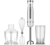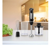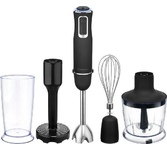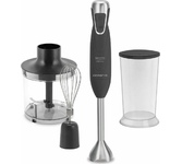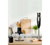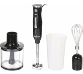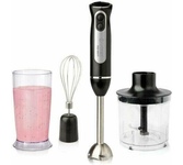 Мощность 1000 Вт. Погружная часть и лезвия из нержавеющей стали. Корпус из пластика с покрытием soft-touch, декорирован нержавеющей сталью. Плавная регулировка скорости. 5 скоростей. Турборежим. Скорость вращения: 15000 об/мин ±15%. Насадка-венчик для взбивания. Стакан для смешивания 600 мл. Насадка для приготовления пюре. Насадка-блендер для измельчения и смешивания. Насадка-измельчитель объёмом 500 мл. Индикация включения с синей подсветкой. Длина шнура 1,2 м.. Электропитание 220-240 В., 50-60 Гц.
