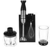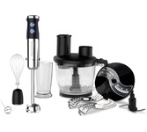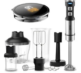 Блендер погружной многофункциональный 8 в 1 Мощность: 1300 Вт Напряжение: 220-240В, 50/60Гц Объем чаши: 0.8л Объем стакана: 0.6л Кол-во скоростей: 12 Импульсный режим (турбо): да LED подсветка кнопок Тип двигателя: DC