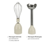 2 скорости работы Обычный и Turbo режим Регулятор скорости Ножи из нержавеющей стали Металлическая насадка блендер Стакан для смешивания 600 мл с крышкой Венчик Вспениватель молока Петля для подвешивания Мощность 600 Вт Длина шнура 1,5 м