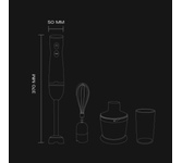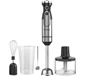 Ручной блендер 3 в 1: блендер/миксер/измельчитель, Мощность: 800 Вт, 2 скоростных режима, Тип управления Механический, Скорость работы в основном режиме 15000 об/мин., Насадки (блендер, венчик) из нержавеющей стали, Объем чаши измельчителя 500 мл, Мерный стакан 600 мл, Защита от перегрева/перегрузки, Параметры электропитания 220-240 В, 50-60 Гц
