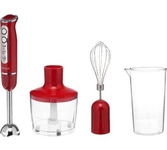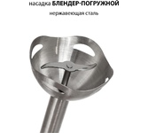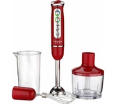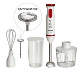 Номинальная потребляемая мощность 800 Вт. Объем чаши мини-измельчителя 860 мл. Объем мерного стакана 600 мл. Индикатор сети с LED-подсветкой кнопок. Нож и насадка из нержавеющей стали с 4 лезвиями. Плавная регулировка скорости. Режим ТУРБО. Три сменных насадки. Противоскользящие ножки чаши мини-измельчителя. Низкий уровень шума. Цвет: красный. Насадка для измельчения и перемешивания. Венчик с держателем. Мини-измельчитель с крышкой. Мерный стакан.