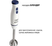 Максимальная мощность: 800вт; 3 в 1: насадка блендер, насадка-венчик, насадка-измельчитель; Корпус блендера из Высококачественный АБС-пластик; Количество скоростей: 1 режим скорост; Шнур электропитания: 1 м; Защита двигателя от перегрузки: термостат (автоотключение до полного остывания двигателя); Чаша для резки (500мл); Мерный стакан (700мл); Номинальное напряжение: 220 – 240в; Вес нетто/ брутто (кг) : 0,93 / 1,32 кг; Габариты упаковки (ШхГхВ): 390х145х270 мм