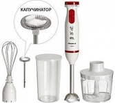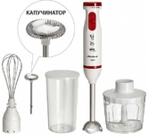 Параметры Максимальная мощность 1000 Вт Номинальная потребляемая мощность 600 Вт Объем чаши измельчителя 500 мл Объем мерного стакана 700 мл Описание Блендер электрический предназначен для смешивания, измельчения и взбивания продуктов и жидкостей в бытовых и аналогичных условиях Цвет: белый с красным Насадка и нож из нержавеющей стали Специальная заточка ножей Мерный стакан с крышкой Четыре сменные насадки: капучинатор из нержавеющей стали для приготовления молочной пенки, используемой для кофе измельчитель для измельчения орехов, трав, яиц, мяса, сыра, лука, рыбы, хлеба, чеснока, овощей и т.п. насадка для измельчения и смешивания для работы с мягкими и жидкими продуктами (приготовление соусов, супов, майонеза, детского питания, пюре, всех видов коктейлей и т.п.) венчик для взбивания яичных белков, сливок, смешивания жидких продуктов, замешивания жидкого теста Плавная регулировка скорости Режим «ТУРБО» Упаковка: цветная коробка