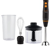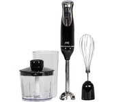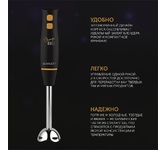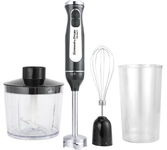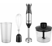 Блендер погружной, набор, максимальная мощность 800 ватт, 2 скорости включая режим ТУРБО , погружная часть блендера из нержавеющей стали, измельчитель 500 мл, мерный стакан 700 мл, венчик для взбивания, цвет корпуса черный с хромированной вставкой.