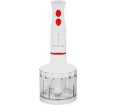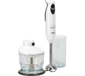 Блендер; Мощность: 1500Вт; Мерный стакан: 700мл; Чаша измельчителя : 500 мл; Число скоростей: 2; Плавный регулятор мощности; Удобная эргономичная ручка; Ножи из нежавеющей стали; Металлическая погружная часть; Венчик для взбивания; Сеть: 220-240 В, 50\ Гц