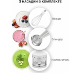Блендер погружной многофункциональный 3 в 1 Мощность – 1200 Вт Напряжение – 220-240 В, 50-60 Гц Тип двигателя – DC Скорость вращения двигателя – 13000-18000 об/мин Чаша измельчителя – 500 мл Стакан для смешивания – 700 мл Режим «Турбо» - есть Плавная регулировка скоростей – есть