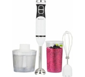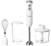 Блендер * Мощность: 1500 Вт * Мерный стакан: 700 мл * Чаша измельчителя: 500 мл * Венчик для взбивания * Ножи из нержавеющей стали * Число скоростей: 2 * Удобная эргономичная прорезиненная ручка * Плавный регулятор мощности * Металлическая погружная часть * 220-240 В, 50\ Гц * Мощный мотор *