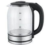 Объем 1,8 л Корпус из термостойкого стекла Шкала уровня воды Внутренняя подсветка Закрытый нагревательный элемент из нержавеющей стали Поворот на подставке 360° Защита от работы без воды Автоматический выключатель Место для хранения шнура Мощность 1500 Вт Цвет чёрный