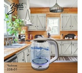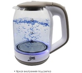 Мощность 2200Вт, Максимальный объем 1.7л, Жаропрочное стекло, Фильтр от накипи, Индикатор уровня воды, Индикатор включения, Автоотключение, Вращение на подставке 360 градусов, Кнопка открытии крышки,Внутренняя подсветка, Напряжение 220-240В, 50/60Гц.