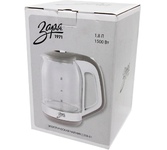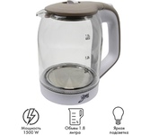 Корпус из термостойкого стекла. Объем 1,8 литра. Иллюминация. Специальная ручка от скольжения. Поворот на подставке на 360°. Быстрое закипание. Фильтр от накипи . Закрытый нагревательный элемент. Автоматическое отключение. Защита от перегрева без воды. Электрошнур в цокольной подставке, 48см. Номинальная мощность 1500 Вт. 230 B ~ 50 Гц.