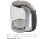 Мощность: 2200 Вт. Объем: 1,7 л. Материал корпуса: стекло. Тип нагревательного элемента: скрытый. Покрытие нагревательного элемента: керамика. Поддержание заданной температуры воды. Блокировка включения без воды. Блокировка крышки. Индикатор уровня воды. Индикация включения. Фильтр.