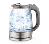Корпус из термостойкого стекла Объем 1,5 литра Иллюминация Специальная ручка от скольжения Поворот на подставке на 360° Быстрое закипание Фильтр от накипи Закрытый нагревательный элемент Автоматическое отключение Защита от перегрева без воды Электрошнур в цокольной подставке Номинальная мощность 2000 Вт 230 B ~ 50 Гц