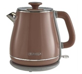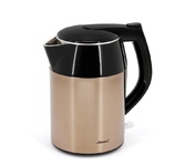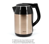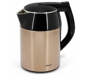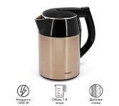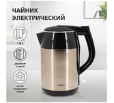 Чайник электрический. Объем: 1,8литра, Мощность: 2200 Вт, Двойной корпус: внутренний - из высококачественной нержавеющей стали; внешний корпус из пластика, Закрытый нагревательный элемент из нержавеющей стали, Отметка максимального уровня воды внутри корпуса, Световой индикатор работы, Отсек для хранения электрошнура, Автоматическое отключение при закипании, Блокировка включения без воды, Цвет: Коричневый.