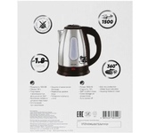 Максимальный объем, л. 1,8. Тип нагревательного элемента диск. Способ открывания крышки вручную. Подставка с вращением на 360? есть. Хранение сетевого шнура в подставке есть. Отключение при закипании есть. Отключение при отсутствии воды есть. Индикатор уровня воды есть. Комплектация чайник, гарантийный талон, инструкция на русском языке. Материал корпуса нержавеющая сталь. Цвет сталь с черными вставками. Потребляемая мощность, Вт. 1500. Электропитание, В., Гц. 220-240, 50.