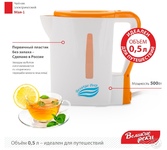 Объём 0,5 л.Корпус из первичного пластика.Спиральный нагревательный элемент из нержавеющей стали.Шкала уровня воды.Мощность 500 Вт.Рабочее напряжение 220-240 В.Частота сети питания 50-60 Гц.Класс защиты: I.Размер прибора: 123х123х140мм (ШхГхВ).Размер прибора в упаковке: 123х123х140 мм (ШхГхВ) Размер транс.упак.: 390х260х310 мм.