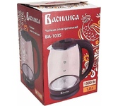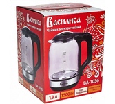 ВАСИЛИСА ВА-1034 Параметры Объем 1,8 л Номинальная потребляемая мощность 1500 Вт Описание Корпус из высококачественного термостойкого стекла Закрытый нагревательный элемент из нержавеющей стали Вращение корпуса на 360° Цвет: черный Шкала уровня воды Внутренняя LED-подсветка Отсек для хранения электрошнура Автоматическое отключение при закипании Блокировка включения без воды Упаковка: цветная коробка