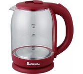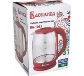 ВАСИЛИСА ВА-1035 стекло бордовый Параметры Объем 1,8 л Номинальная потребляемая мощность 1500 Вт Описание Корпус из высококачественного термостойкого стекла Закрытый нагревательный элемент из нержавеющей стали Вращение корпуса на 360° Цвет: бордовый Шкала уровня воды Внутренняя LED-подсветка Отсек для хранения электрошнура Автоматическое отключение при закипании Блокировка включения без воды Упаковка: цветная коробка