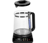 Мощность: 2000. Максимальный объем: 2. Нагревательный элемент: скрытый. Цвет: прозрачный. Вес товара: 1.34. Особенности: Основание с электронным управлением. У данной модели все элементы управления и индикация удобно расположены на основании чайника. Точная регулировка нагрева позволяет выставлять температуру с точностью до градуса. 6 авторежимов.. Дополнительные возможности: 6 готовых програм с оптимальными температурными режимами для идеального заваривания различных видов чая и кофе.. Габариты упаковки (ед) ДхШхВ: 0.25x0.23x0.275. Вес упаковки (ед): 1.93. Страна производства: Китай. Длина шнура: 1. Тип управления: сенсорное. Гарантия: 12 мес.. Размер (ВхШхГ): 270х210х240 мм. Температурные режимы: 6 шт. Материал корпуса: пластик/стекло. Конструктивные особенности: дисплей, подсветка воды, подставка 360, съемная крышка, фильтр от накипи. Индикация: включения, температуры, температуры нагрева (цветовая), уровня воды. Безопасность: автоотключение, защита от включения без воды. Функции: поддержание температуры,