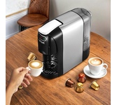 Мощность: 1400. Давление помпы: 20. Объем резервуара для воды: 0.7. Съемный дренажный отсек для капель: есть. Материал корпуса: нержавеющая сталь/пластик. Особенности: Кофеварка «3 в 1»: капсулы типа Nespresso Original и Dolce Gusto, молотый кофе. Тип капсул: Nespresso/Dolce Gusto. Автоматическое выключение: есть. Вес: 3.1. Съемный резервуар для воды: есть. Типы напитков: эспрессо, лунго. Габариты упаковки (ед) ДхШхВ: 0.39x0.147x0.305. Вес упаковки (ед): 4.05. Страна производства: Китай. Гарантия: 12 мес.. Размеры: 118 х 290 х 258 мм. Цвет: серебристый, черный. Функции: автовыключение. Мощность: 1400 Вт. Объем резервуара для воды: 0.7 л. Капсулы: Nespresso/Dolce Gusto. Давление: 20 Бар