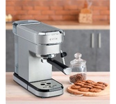 Кофеварка рожковая. Мощность: 1350 вт, Давление помпы: 15 бар, Съемный резервуар для воды: 1,2 литра, Капучинатор, Индикатор уровня воды, Индикация включения, Подогрев чашек, Приготовление капучино, Приготовление эспрессо, Съемный лоток для сбора капель, Материал корпуса: нержавеющая сталь, Особенности: Итальянская помпа фирмы Ulka; Кофеварка с термоблоком обеспечит безупречный вкус напитка, быстроту приготовления, уменьшить затраты на электроэнергию; Программирование объёма порции кофе, Тип используемого кофе: молотый, Цвет: Серебро