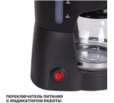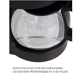 Мощность 600Вт. Вместимость 6 чашек (0,6л). Корпус из высококач. пластика. Стекл. резервуар д/кофе. Система поддержания температуры. Функция Антикапля. Защита от перегрева. Съемный многоразовый фильтр. Цвет: черный.
