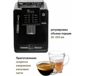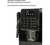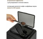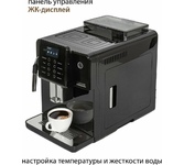Кофемашина для автоматического приготовления американо и эспрессо со встроенной кофемолкой. Мощность 1350 Вт. Интуитивно понятный многофункциональный ЖК-дисплей с сенсорными кнопками управления. Вывод генерации пара для приготовления капучино. Настройка крепости и температуры. Емкость контейнера для зерен: 250 грамм. Регулировка степени помола кофе от 1 до 5. Регулировка объема порции кофе от 20 до 250 мл. Регулировка высоты диспенсера: 70–130 мм (95–145 мл). Съемный резервуар для воды. Съемный варочный узел для легкой очистки. Счетчик порций. Резервуар для воды: 1,7 литра. Давление помпы ARS (Италия): 19 Бар. Емкость контейнера для отработанного кофе:12 порций. Автоматическая подача воды в резервуар. Индикация работы, пополнения воды и кофейных зерен, необходимости очистки от накипи. Цвет: черный