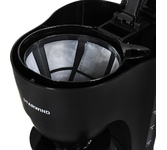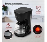 Капельная кофеварка, Мощность 1000 Вт, Объем 1.25 л, Противокапельная система, Функция автоподогрева, Многоразовый фильтр, Защита от перегрева, Индикатор включения/отключения, Кувшин из термостойкого стекла, 10 чашек кофе по 125 мл, Прорезиненные ножки, Мерная ложка в комплекте