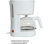 Мощность 600 Вт/ Объем 750 мл ( 6 чашек). Многоразовый фильтр.Мерная ложка. Защита от протекания кофе. Нагревательный элемент с антипригарным покрытием