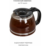 Капельная кофеварка, Мощность 750 Вт, Объем 1.25 л, Противокапельная система, Функция автоподогрева. Сохраняет кофе горячим, Многоразовый фильтр, Защита от перегрева, Индикатор включения/отключения, Кувшин из термостойкого стекла, Мерная шкала, 10 чашек кофе по 125 мл, Мерная ложка в комплекте, Электропитание 220-240 В, 50-60 Гц