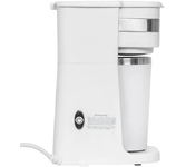 Кофеварка капельная с термокружкой, Термокружка из нержавеющей стали объема 450 мл, Объем резервуара для воды 420 мл, Вместимость фильтра до 20 грамм молотого кофе, Приготовление напитка из молотого кофе, Время приготовления около 4 мин, Автоматическое отключение при отсутствии воды, Многоразовый нейлоновый фильтр - удобно мыть, Компактный размер, Индикация включения, Корпус из высококачественного пластика, Мощность: 750 ватт, Питание 220-240 В, 60/50 Гц
