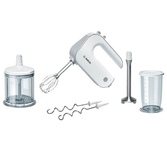 Мощность: 500 Вт. Современный мотор: мощный и одновременно легкий и тихий. Эргономичная форма корпуса с мягкими вставками Soft-Touch. 5 ступеней скорости вращения. Дополнительно: импульсный (турбо) режим (максимальная скорость). Отдельная кнопка для отделения венчиков и крюков. 2 венчика Fine Creamer для нержавеющей стали: больше объема за меньшее время. 2 крюка для замеса теста. Возможность подсоединения насадки-блендера. Кнопка для отсоединения ножки блендера XL-Универсальный измельчитель со съемным ножом из нержавеющей стали. Ножка блендера из высококачественной нержавеющей стали. Стакан для перерабатываемых продуктов со шкалой+ крышка.