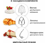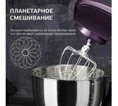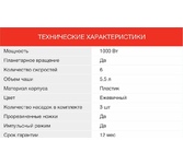 Мощность 1000 Вт Планетарное вращение ДА Количество скоростей 6 Объем чаши 5.5 л Количество насадок в комплекте 3 шт Прорезиненные ножки ДА