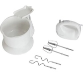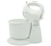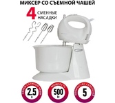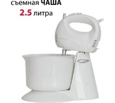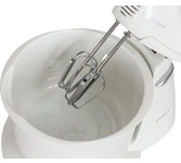 Миксер с чашей. Мощность: 500 Вт. Режим "Турбо". 5 скоростей. Две насадки: для взбивания яиц и крема и для замеса тяжелого теста. Цвет: белый