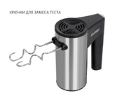 Мощность 500Вт. 5 скоростей. Режим Турбо. Насадки: 2 насадки для взбивания яиц и крема; 2 насадки для замеса тяжелого теста. Материал корпуса пластик.