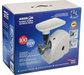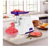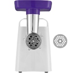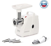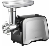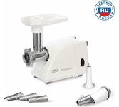 Макс. мощность 1500 Вт, номинальная мощность 230 Вт, производительность — до 100 кг/час, Защита двигателя от перегрузки; 3 вида решеток для получения фарша разной консистенции - с диаметром отверстий 4,9 мм и 7 мм, а также овальными отверстиями; Удобное хранение ножей и решеток; Высокое размещение шнековой камеры; Функция РЕВЕРС для предотвращения наматывания жилок на шнек; Устойчивые нескользящие ножки для фиксации мясорубки на поверхности стола.