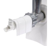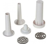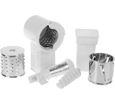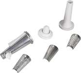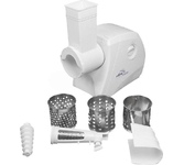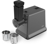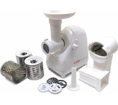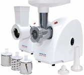 3 в 1: мясорубка / овощерезка / шнековая соковыжималка, Прорезиненные ножки, 2 диска с отверстиями 5 и 7 мм, Крупная терка, Мелкая терка, Насадка для кеббе, Насадка для колбас, Слайсер, Толкатель, Шнековая соковыжималка