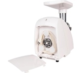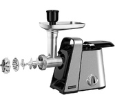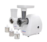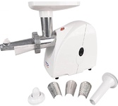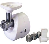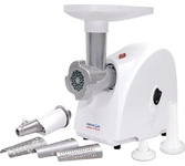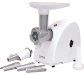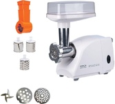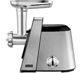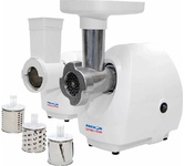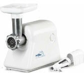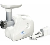 максимальная мощность 1500 Вт, номинальная мощность 230 Вт, производительность — до 100 кг/час комплектуется приставкой — соковыжималкой. Предназначена для получения соков с мякотью из мягких овощей, фруктов, ягод; набивки колбасных изделий. 3 вида решеток для получения фарша разной консистенции - с диаметром отверстий 4,9 мм и 7 мм, а также овальными отверстиями; Удобное хранение ножей и решеток; Высокое размещение шнековой камеры; Устойчивые нескользящие ножки для фиксации мясорубки на поверхности стола; Защита двигателя от перегрузки;