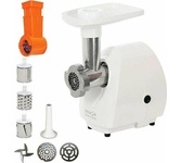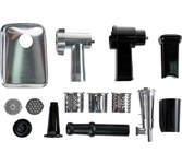 Максимальная мощность 2000 Вт. Производительность 2 кг/мин. Функция «Реверс». 2 диска из нержавеющей стали для крупного и мелкого помола (5 мм и 7 мм). Насадки для тёрки, резки, шинковки. Насадка для приготовления колбас. Насадка «Кеббе». Толкатель для продуктов. Отсек для хранения дисков. Прорезиненные противоскользящие ножки. Металлический лоток. Защита от перегрева. Защита двигателя от перегрузки. Электропитание 220-240 Вт, 50-60 Гц.