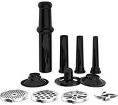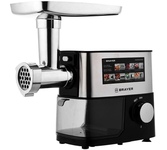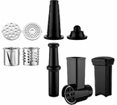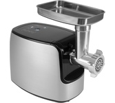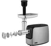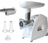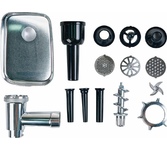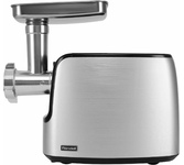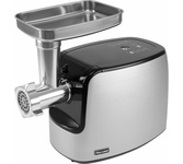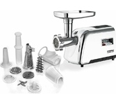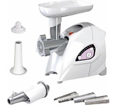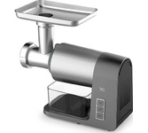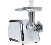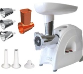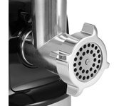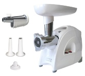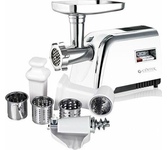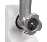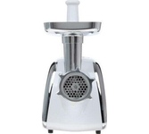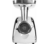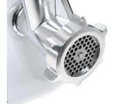 Мощность 2200 Вт / Вместимость загрузочного лотка 2 кг / Производительность 1,8 кг/мин / Скорость вращения шнека до 195 об/мин / Насадка для колбасок и кеббе в комплекте / Контейнер для мяса в комплекте / Металлические диски 4 мм + 7 мм + решетка мельница