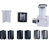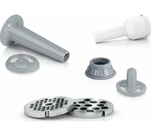 Максимальная мощность 2000 Вт Производительность 2 кг/мин Функция «Реверс» 3 диска из нержавеющей стали (3 мм, 5 мм и 7 мм) Насадка для приготовления колбас Насадка «Кеббе» Насадка для драников Насадка для терки Насадка для нарезки овощей ломтиками Cъемный лоток из стали Контейнер для фарша и хранения аксессуаров Толкатель для продуктов Прорезиненные противоскользящие ножки Защита от перегрева Максимальный уровень шума 80 дБ Электропитание 220-240 В, 50 Гц