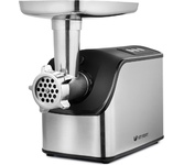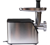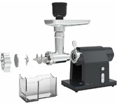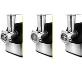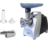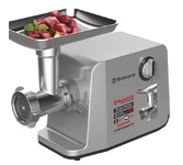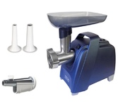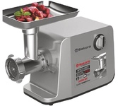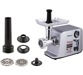 Мясорубка электрическая, мощность 3000 Вт, функция реверс, литой алюминиевый корпус, две скорости работы, мощный медный мотор с защитой от перегрева, металлические шестеренки и металлический редуктор, набор решеток для фарша: маленькая (4мм), средняя (7мм) и для рубки мяса, низкий уровень шума - менее 85 дБ, простой и надежный фиксатор рабочей головы, прорезиненные нескользящие ножки. Аксессуары: насадки для приготовления сосисок и колбасок кеббе. Производительность: 2.5кг/мин. Цвет: серый.