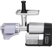 Макс. мощность 2000 Вт; номинальная 600 Вт, производительность 2 кг/мин.; реверс; защита двигателя от перегрузки, металлич. корпус, ножи и решетки из нерж.стали, насадка для томатного сока