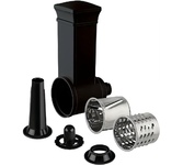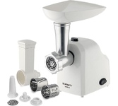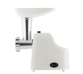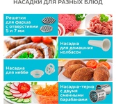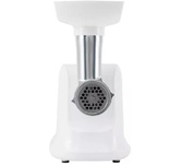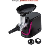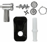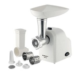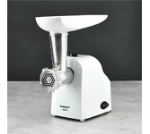 Мощность 1800 Вт, функция РЕВЕРС, 3 решетки с отверстиями разного диаметра (3/5/7 мм), решетки и нож из высококач. нерж. стали, удобный толкатель, насадка для приготовления домашней колбасы, насадки "КеББЕ", материал корпуса пластик, материал лотка - пластик.