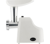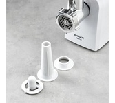 Высокая мощность мотора позволяет мясорубке производить фарш со скоростью 2,5 кг в минуту. Вы сможете и быстро приготовить мясное блюдо на обед, и заготовить полуфабрикаты впрок для хранения в морозилке. В комплект входят два диска для фарша с отверстиями диаметром 5 и 7 мм, что позволит выбрать оптимальную текстуру для различных блюд: от тефтелей до бифштексов. Внесите разнообразие в рацион при помощи насадок для кеббе и домашних колбасок. Управление очень простое: одна кнопка включает и выключает устройство, а также запускает реверс. Он пригодится, если на шнек намотаются мясные волокна и жилки, и избавит вас от необходимости прерываться для разборки и чистки прибора. Металлическая «голова» прибора удобно складывается в его корпус. Пластиковые насадки и запасной диск хранятся в толкателе, есть также отсек для сетевого шнура. Прорезиненные ножки прочно удержат прибор и не позволят ему упасть со стола.