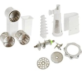 Максимальная мощность 2000 Вт 3 диска из нержавеющей стали (3, 5 и 7 мм) Насадка для драников Насадки для терки, резки, шинковки Насадки для приготовления колбас Насадки Кеббе Толкатель для продуктов Отсек для хранения дисков Прорезиненные противоскользящие ножки Защита от перегрева Защита двигателя от перегрузки Номинальная мощность 600 Вт Электропитание 220 240 В, 50 Гц