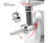 Мясорубка, максимальная мощность: 2500Вт, функция реверс, нож из нержавеющей стали, 2 решетки в комплекте: 5мм, 7мм, пластиковый лоток, прорезиненные ножки, производительность (макс): 2,7 кг/мин, насадки для приготовления колбасок и кеббе, механический фиксатор блока мясорубки, цвет: черный